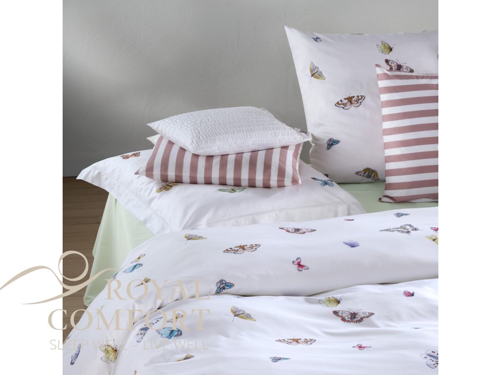 The Vanessa bed linen from Atelier collection reveals its beauty as delicately as the butterflies that define its design. Fine lines and filigree details give the wings a light, almost weightless appearance as they float across the smooth satin surface. Soft tones bring a sense of summer, freedom, and natural elegance into the bedroom.